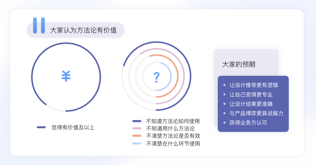 学习方法论会给我们带来诸多好处。但问卷也反映出了大家遇到的一些问题。比如,“对方法论了解较少”、“只知道常用的方法论”、“在实际运用中不知道用什么方法论”、“不知道如何使用”、“不清楚在什么环节使用”、“不清楚是否有效”等。