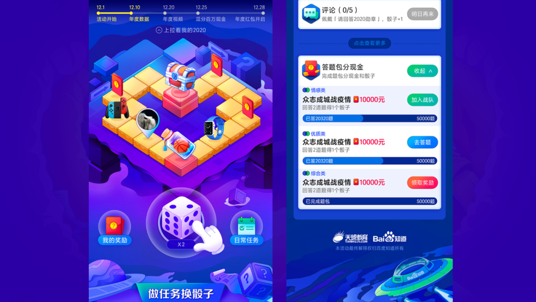 今年的活动聚焦2020年的人和事,结合各行各业的创作者一起总结,引发用户对这特殊一年的情感共鸣。比起去年组队答题的玩法,今年降低用户参与成本,通过2020红包、大富翁游戏、任务系统等多重手段,扩大《请回答2020》在站内外的影响力,增强用户对知道品牌的认知,把《请回答》做成有互联网记忆的连续性品牌活动。