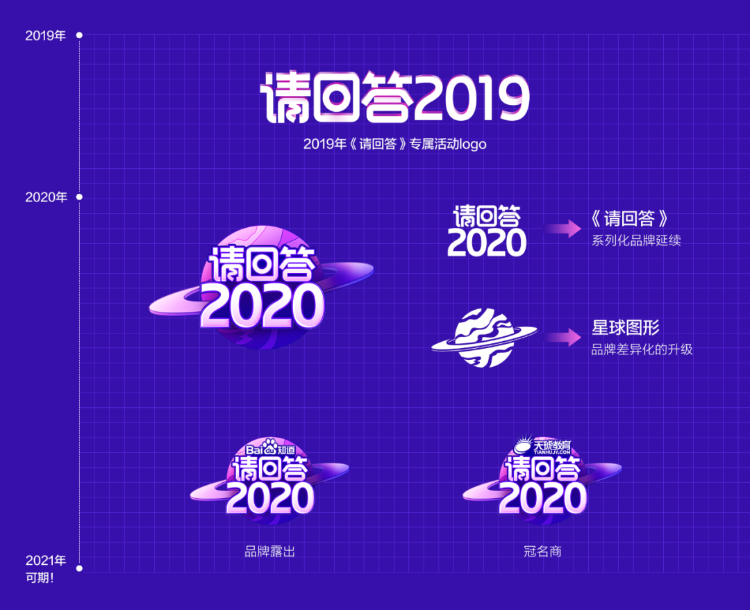 2019年是这个活动首次亮相,作为品牌活动我们设计了专属的logo,今年的活动首先要延续《请回答》的品牌唤起用户对这个活动的回忆。视觉上保持之前的字体风格,改变排版形式,强化知道的品牌露出,且适配活动冠名的需求,同时加入了星球的图形,寓意知识像星球一样充满奥秘感,这也作为今年品牌差异化的升级。