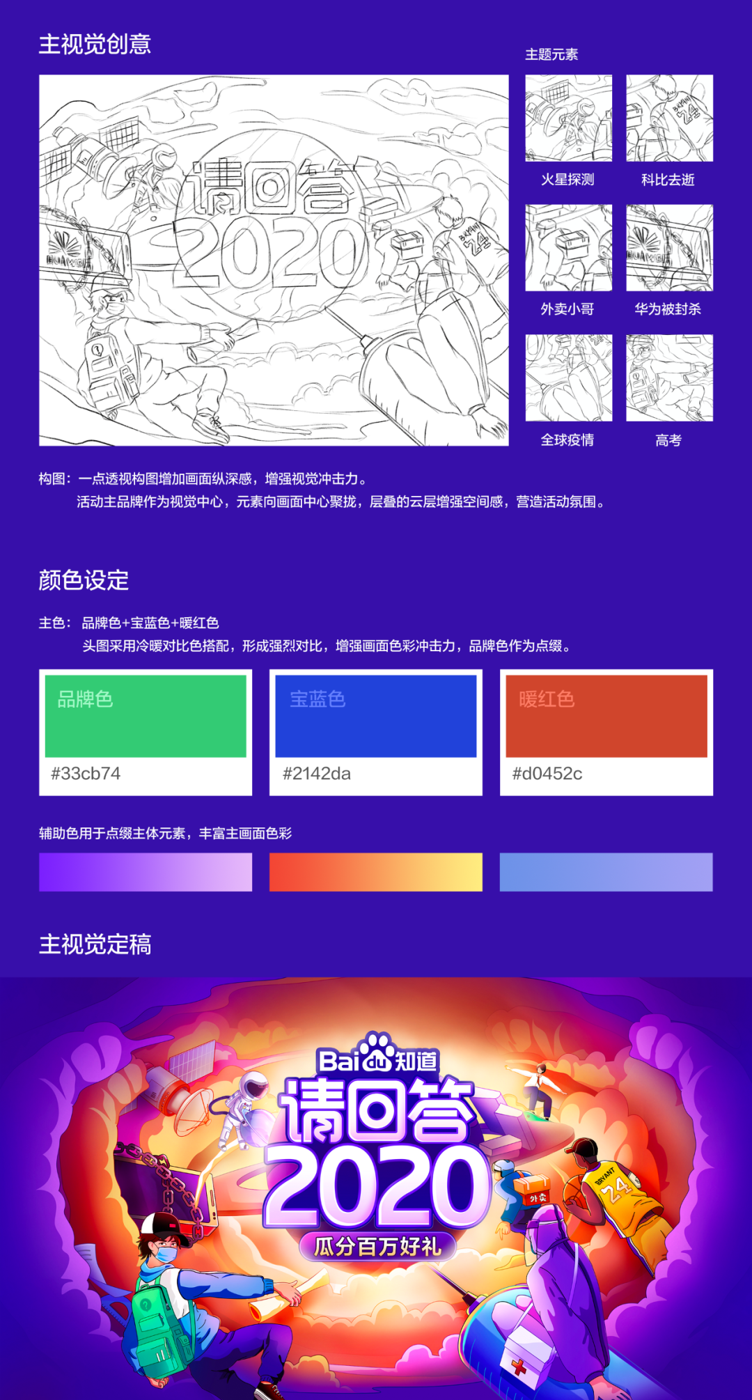 前面讲到2020年的特殊性,基于有温情的品牌活动的设计目标,主视觉突出人格化,体现知道有各行各业的人以及2020年的一些大事件。