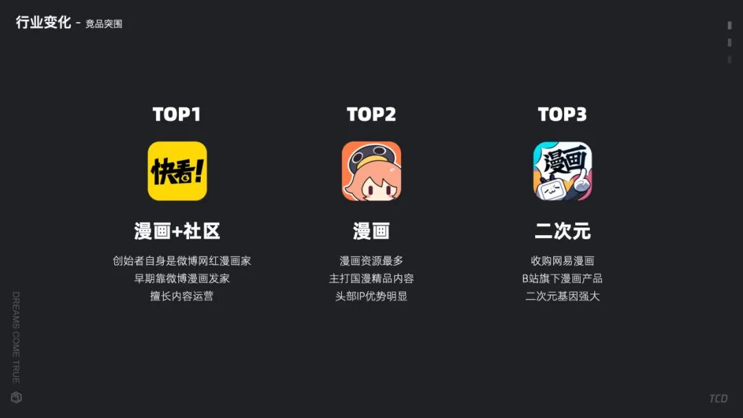 漫画行业近几年属于红海市场,随着行列竞争日益激烈,除了腾讯动漫国内市场上也出现了不少头部动漫产品如快看漫画、哔哩哔哩漫画、咚漫漫画等,加上短视频冲击,导致动漫内容整体大盘逐步开始出现被分流的状态,这是从行业角度能够观察到的行业形态上的变化。