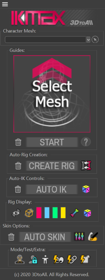 IKMAX拥有高度简化的工作流程,用户只需要选取角色网格就可以创建关节,插件会自动生成绑定,并为角色蒙皮,同时简化衣服、物体连接到各个身体部位的工作流程。