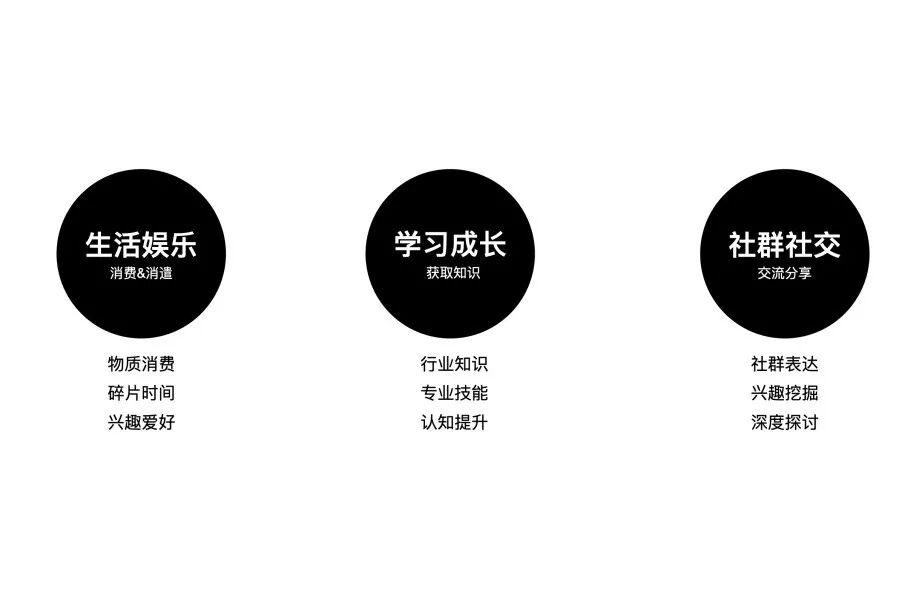 需求分类:在不同场景下,用户对于内容诉求也不一样。生活方面,利用碎片化时间娱乐消遣或消费的需求;工作方面,对于专业技能和行业知识的诉求;社交方面,分享交流以及对于垂类内容深度挖掘的诉求;在生活的任何场景下都有会有对于内容的诉求所在,这也是为什么未来互联网产品发展中内容会成为最核心的要素之一。