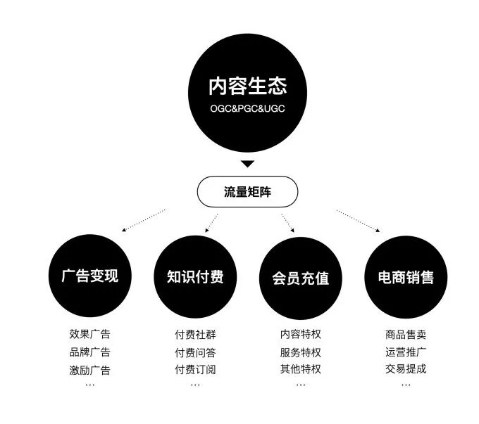 **商业模式:**内容产品的核心本质是打造内容生态,依靠内容产生流量,在流量矩阵上进行不同方式的商业变现。常见的商业变形方式主要有广告变现、知识付费、会员充值以及电商销售等等。广告变现:是平台型大流量产品的核心商业收入之一,比如今日头条、腾讯新闻等,这类内容分发型产品核心收入来源于广告;知识付费:这也是很多内容产品的主要变现模式,比如得到、喜马拉雅、以及知乎Live核心收入来源都是付费订阅为主。会员充值:通过购买会员获取更多的内容和服务特权,代表产品腾讯视频、爱奇艺、优酷等等;电商销售:变现形式比较多样化,主要通过商品售卖、提供运营推广(也属于广告变形)、以及交易提成(平台佣金)为核心收入来源。