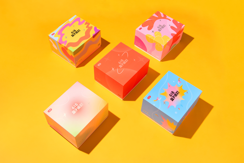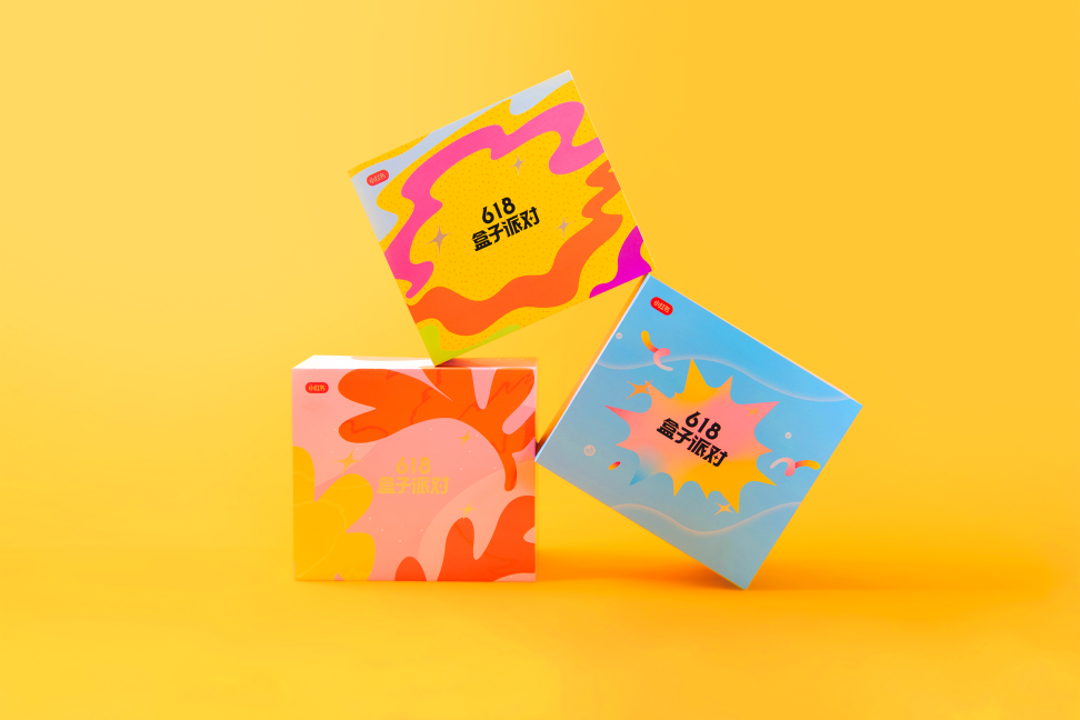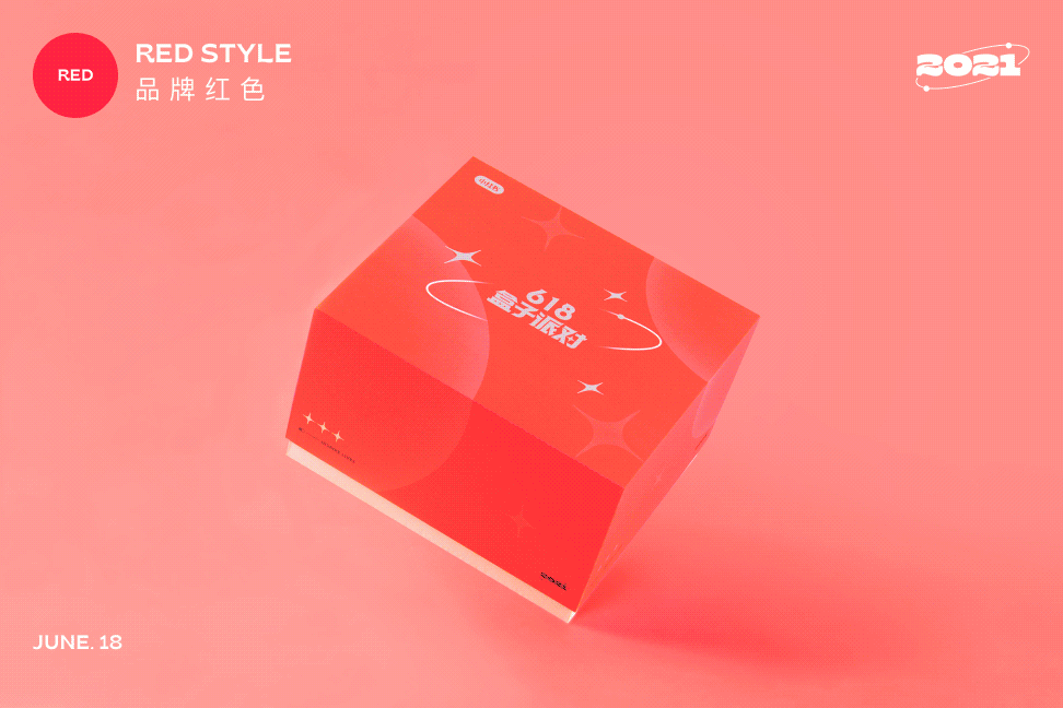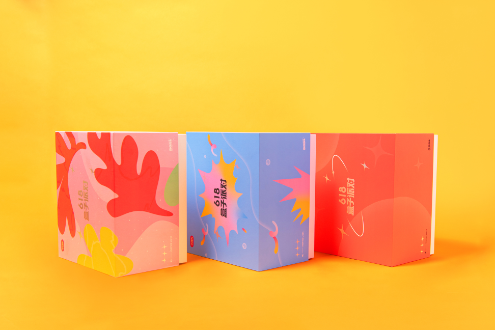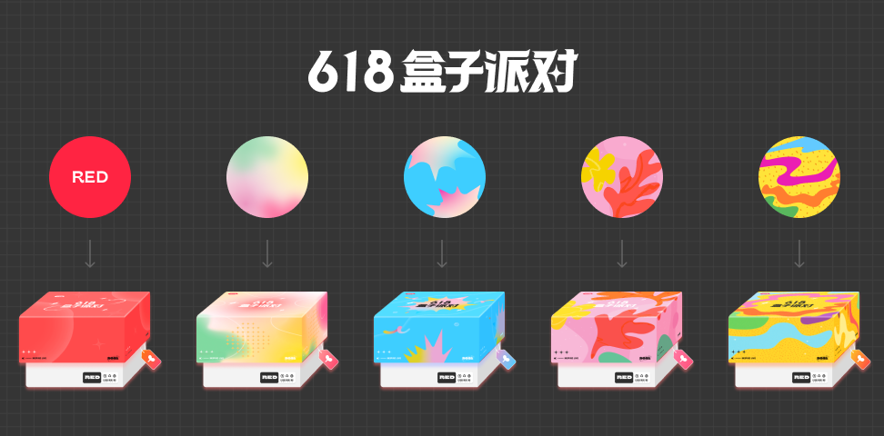**主题设定:**为满足不同用户在定制专属礼盒时的新鲜感与惊喜感,本次活动需要设计5款盒子皮肤。我们以“派对”为核心,延伸出5个不同主题,分别为:品牌红色、梦幻渐变、夏日碰撞、清新文雅、涂鸦泼墨。