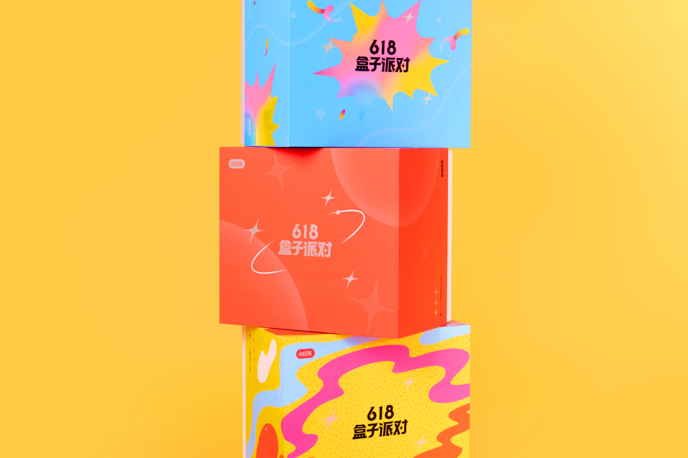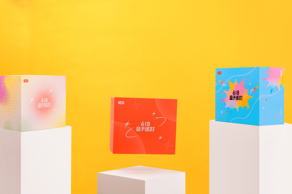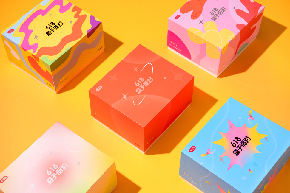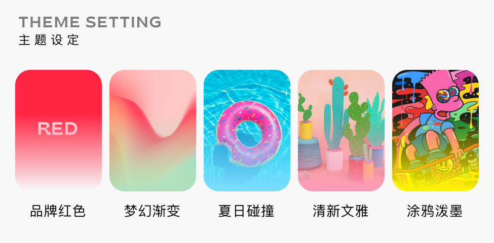 **品牌红色:**默认盒子主题,品牌红色,点缀星星图案纹理,突出品牌基因。**梦幻渐变:**梦幻派对主题,弥散渐变,图形抽象化、模糊化,整体气质较为柔和。**夏日碰撞:**夏日派对主题,明亮蓝色,辅以尖锐图形纹理与高饱和度色彩点缀,突出视觉碰撞。**清新文雅:**文艺派对主题,淡雅粉色,运用抽象植物与线条,风格走清新路线。**涂鸦泼墨:**狂欢派对主题,缤纷多彩,油彩泼墨流体图形,更加自由大胆鲜活。