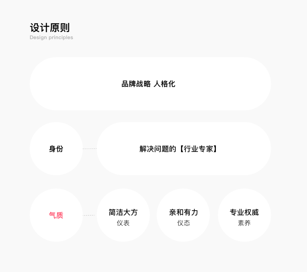 建立设计原则时(设计语言的标准),不妨尝试把品牌战略人格化,由所有人解决所有人问题的愿景,得出产品是一个解决问题的行业专家的身份,Ta传达的气质是简洁大方的仪表,亲和有力的仪态,和专业权威的素养。