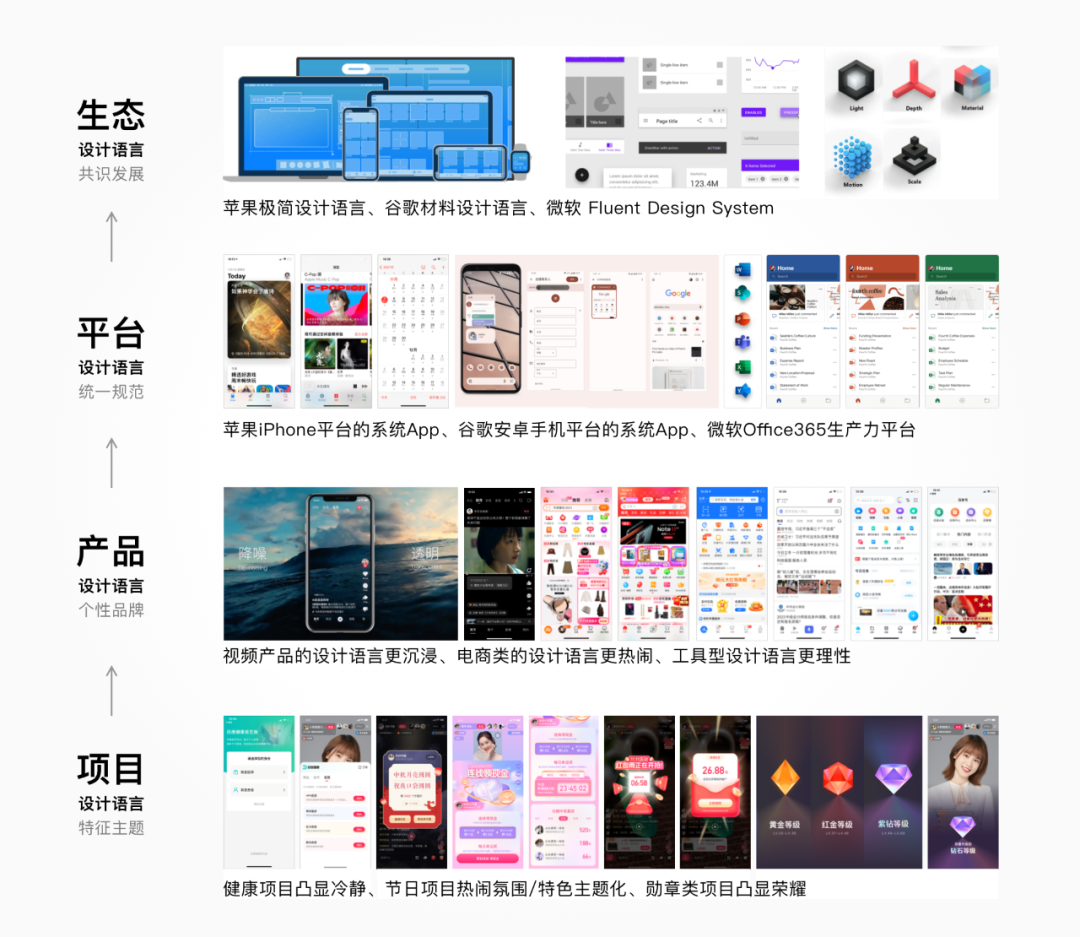 设计语言最底层是项目设计语言,具有典型特征和主题,比如医疗项目凸显专业冷静,节日项目凸显热闹氛围。往上一层是产品设计语言,强调个性品牌,比如小视频的设计深色更沉浸,电商从结构到色彩都凸显热闹。很多产品随着发展,形成一些系列平台服务,平台设计语言确保服务“统一规范”。最顶层是生态设计语言,跨设备跨平台和硬件呈现的设计语言。