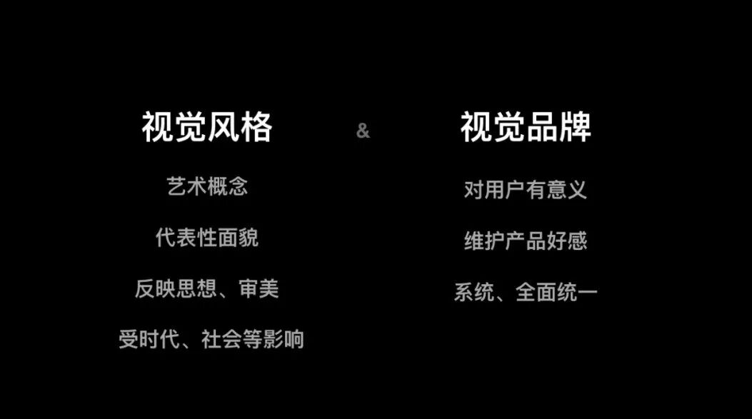 风格是艺术概念,是在整体上呈现的有代表性的一种面貌。风格能反映时代、思想、审美等特性。也是设计师对审美独特鲜明的理解。那么视觉品牌呢?它除了要体现产品本身特性,融入产品希望传达的感受,也要思考什么对用户有意义。研究视觉品牌,就是探索如何通过设计维护用户对于产品的好感度 ,通过有共鸣的设计传递正能量,让产品获得最大的认同。简单来说:视觉风格重点是设计师对审美的传达;视觉品牌则是通过挖掘产品有价值的特点,创造有共鸣的视觉去打动用户,助力产品。