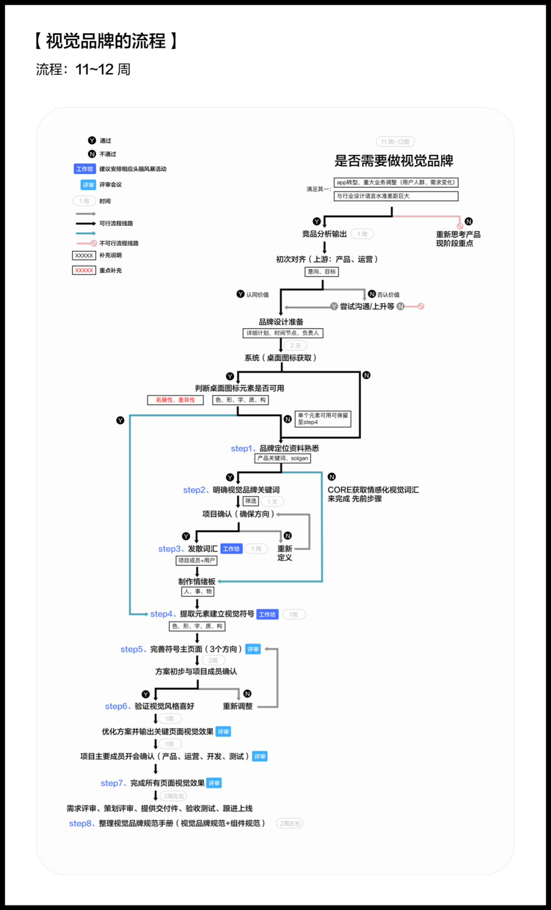 结合过往的业务经验来看,对于已有视觉风格的产品来说,需要满足以下两个情况之一才是最适合做视觉品牌工作的时候:1、产品转型、重大业务调整(包括用户人群、需求变化等);2、与相关行业设计语言水准差距巨大。另外需要考虑的还有时间安排,由于整个流程耗时需要大约12周(3个月),所以设计师前期就要做好时间规划。