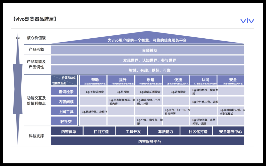 了解完视觉品牌的概念,我们简单聊下它的作用。视觉品牌最大作用是建立用户和产品的关系。vivo互联网单个产品的视觉品牌也受vivo母品牌影响,不同业务被渗透的程度不同。比如vivo品牌对vivo官网,vivo商城影响比较大,但是对浏览器,i视频,短视频的影响就比较小。
