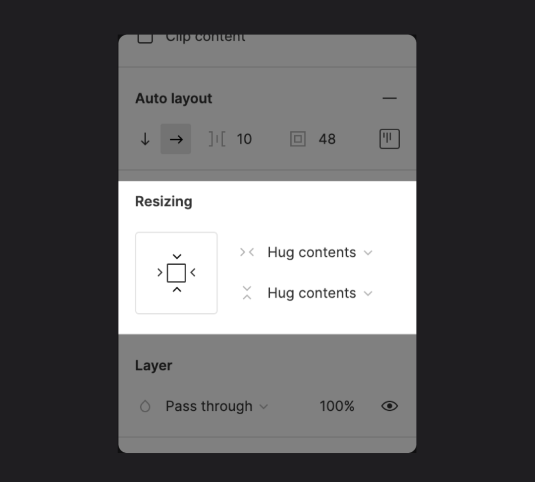 如果你创建了一个自动布局,那么你会发现,在auto layout面板下面,会多出这么一个玩意儿,它就是Resizing。