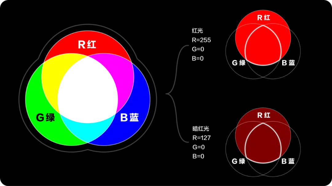 RGB 是从颜色的发光原理来设定的, 相当于红、绿、蓝三个颜色通过不同亮度, 来组合成需要的颜色。用灯光来解释,0就是没开灯,255就是开到最亮,所以当红色光线开到最亮而其它两个色光都不开时,就是RGB(255, 0, 0)只有红光。如果把红色光开一半,还是不开其它两个色光,RGB(127, 0, 0)那么就会变成暗红色。