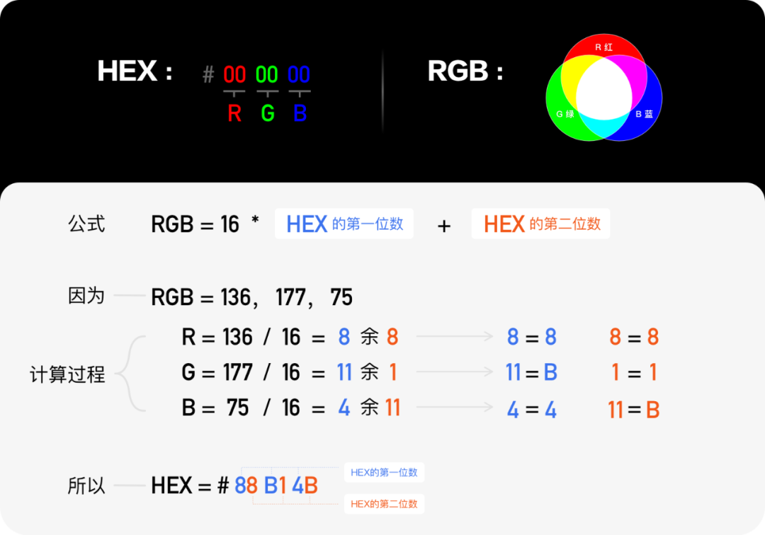 基本上HTML & CSS中的16进位码色彩由三组数(6个数字/字母)组成,HEX 与 RGB 中每个颜色又是一一对应的关系,感兴趣的同学还可以看下RGB与HEX的转化公式。