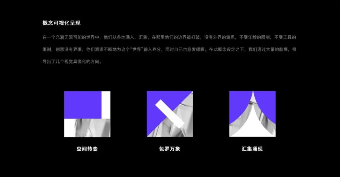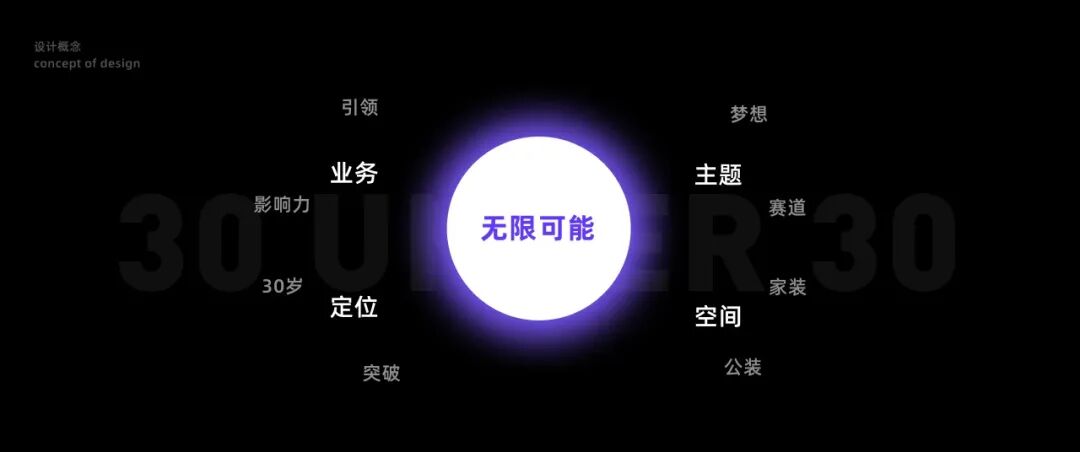 首先是品牌内核的提取,品牌内核是品牌个性、价值传递的基石,结合30 under 30大赛的定位、业务诉求,我们进行发散联想,提炼这一阶段的关键词,最终与业务方达成共识,以构建一个“无限可能”的世界为这次大赛的故事线,来打造30 under 30大赛视觉。