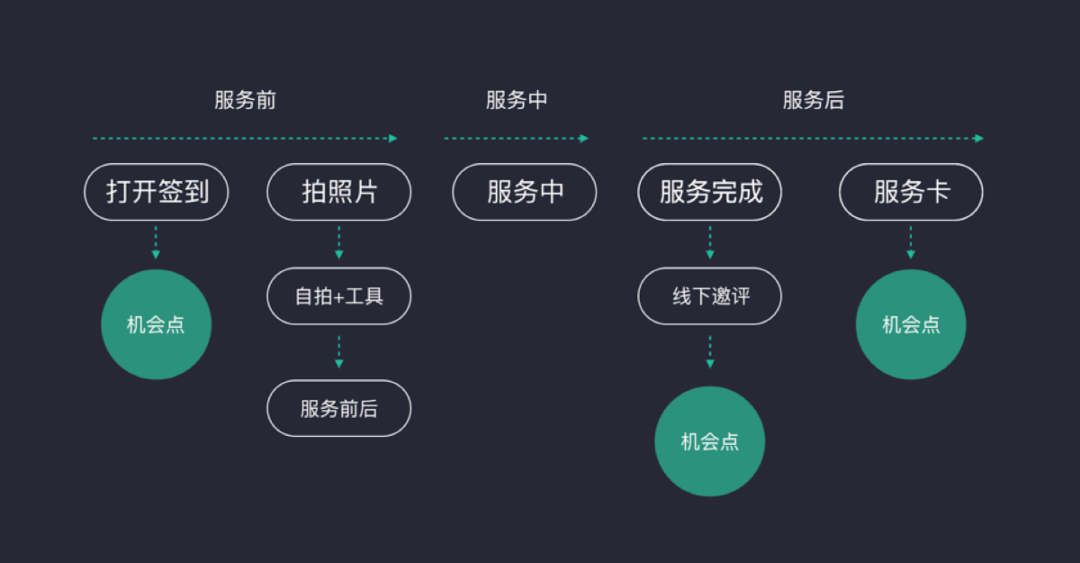 聚焦阿姨服务核心路径,从服务路径的整体节点梳理出服务前、服务中、服务后,的关键触点,探索设计机会点。