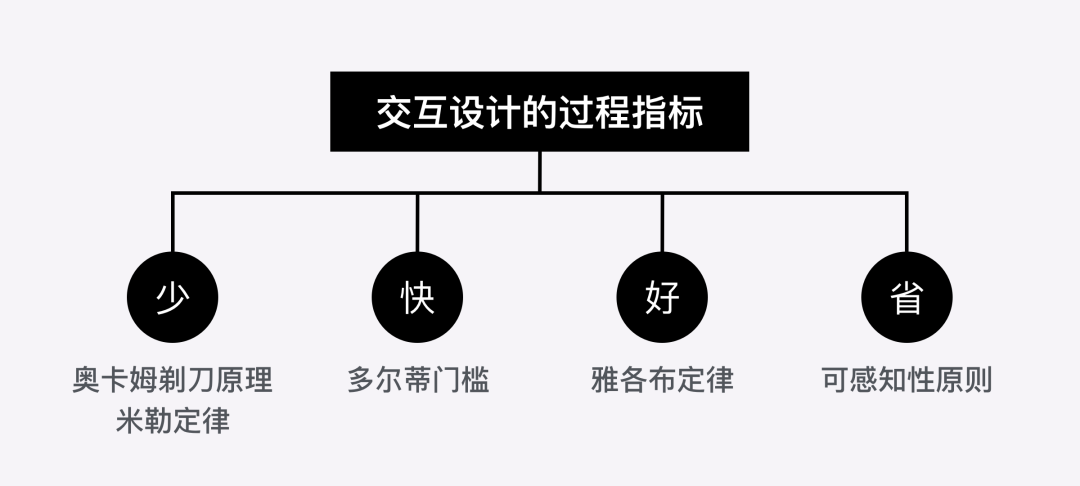 交互设计的终极目标是改变和影响用户的行为,达到期望的业务结果,比如下单率、搜索率等结果指标,结果指标因产品而异,不具有普适性,不可一言以概之。而在交互设计的过程中,以交互设计定律为指导的过程指标是通用的,几乎可以说放之四海而皆准,我把这四个过程指标概括为四字箴言:少快好省。怎么理解呢?