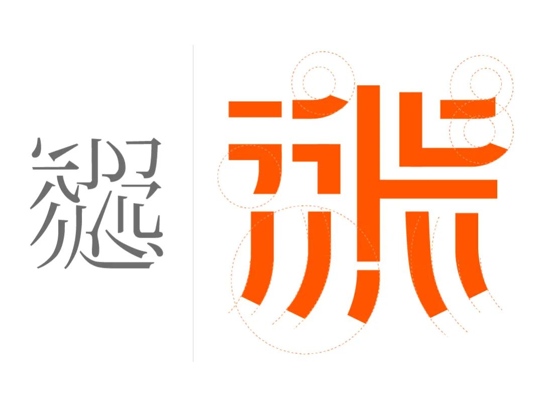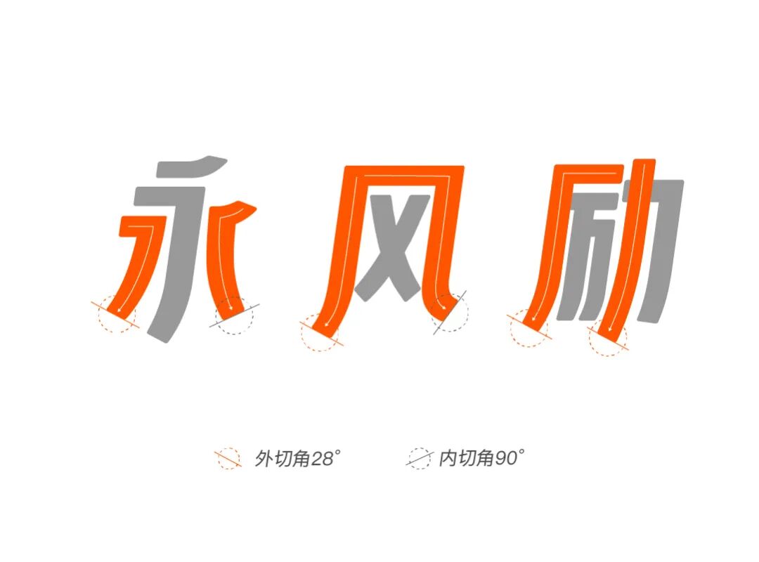微笑体简洁的风格设定,要求简化笔画的同时,亦要兼顾字体的辨识度。所以字体在一些细节上也进行了非常多次的调整。例如在撇捺的尾部末梢规定了两种形式外切角28°和内切角90°,在满足统一角度的情况下,尽可能让笔画的角度自然舒展。