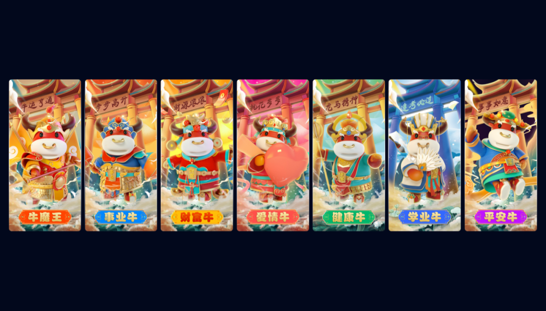 作为2021开年大戏,与以往的设计不同,本次视觉设计引入IP设定的理念,将运营活动品牌化符号化,平台运营设计团队精心打造充满中国年味和吉祥寓意的7款福牛IP形象,拟人化的形象特征和设定,从动作、服饰、道具、称谓等多个维度来填充每个福牛的独特性。让福牛的表情和装扮都鲜活起来;经过三维视觉的精细化打磨手段,呈现出影视动画的视觉品质。通过活动主题“聚福气赢好礼“化构建了可爱萌趣又吉祥的各路福牛给用户带来好运传递好运的故事。