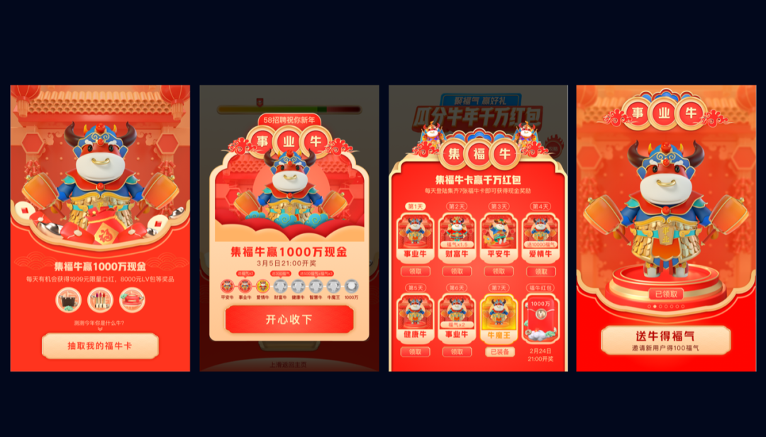活动正式进行阶段,用户首次进入活动后可以直接获得一个主题福牛,每日登陆活动页面,解锁一款全新福牛形象。每个福牛会在用户玩游戏的过程中有不同的动作表现,同时点击福牛也可获得随机福气值,集齐7张福牛的用户可在第7日解锁大礼包。