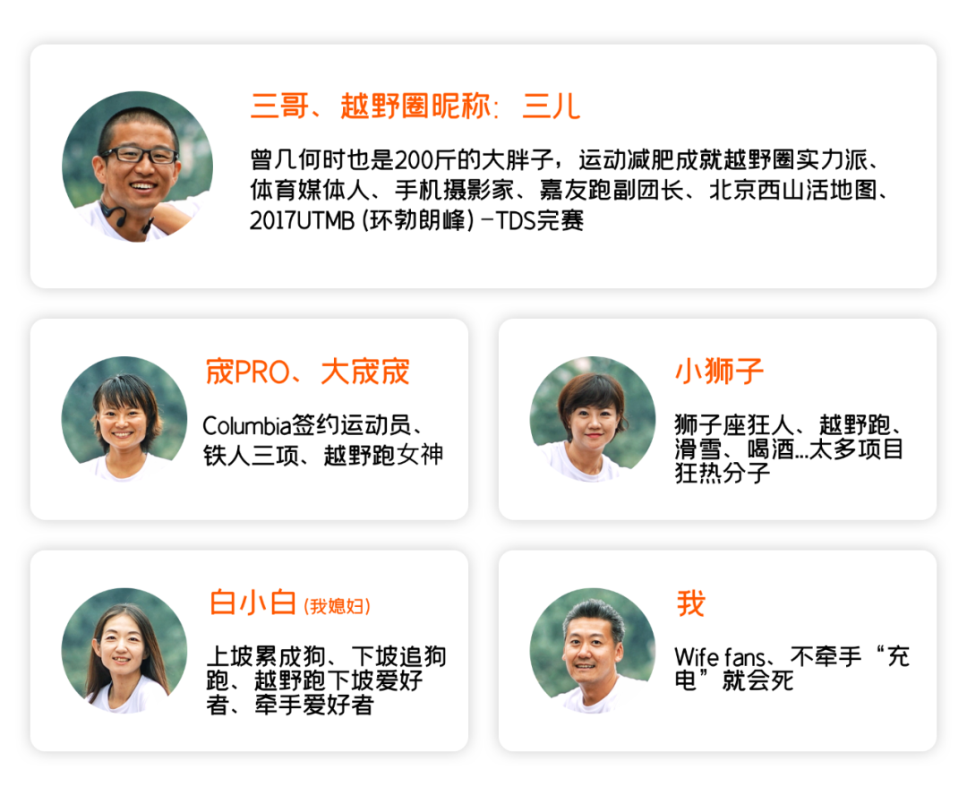 自从确定参赛后,五位队友们就开始施展拳脚,在自己擅长的方面尽力帮助队伍。微信群里顷刻掀起了热烈的脑爆,队中灵魂人物越野圈大佬江湖人称“三哥”,门下跑团名为“坡沸跑”,再加上队内另两位越野高手足以将爬坡跑得热血沸腾,队名最初想法“上坡沸劲”将“坡沸”二字融入其中,但是考虑读音上容易产生歧义,最终确定了队名为**——“上坡不沸劲”**。