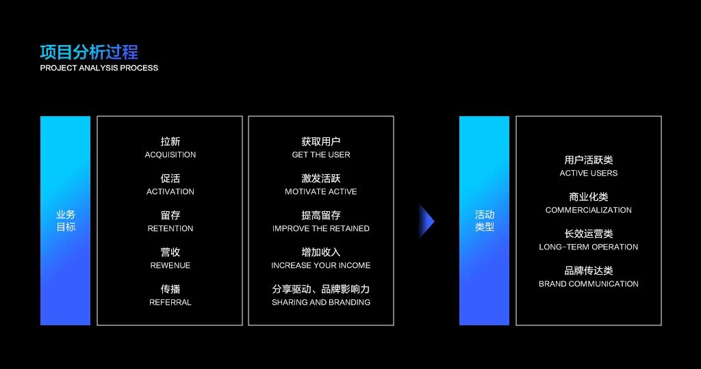 运营活动的业务目标与用户生命周期相关,先拉新,其次促活,接着提高留存,然后获取收入,最后实现自转播,提升品牌的影响力和价值。与之对应的活动类型主要包括:用户活跃类、商业化类、长效运营类、品牌传达类这四大类。