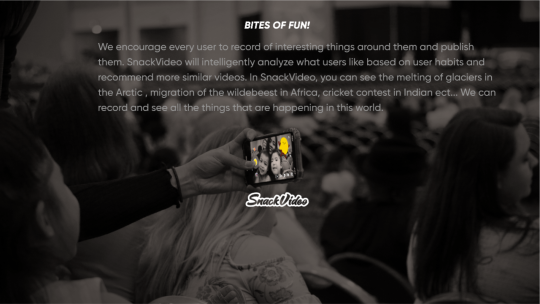SnackVideo品牌使命是通过普惠的推荐算法让人们能够发现,享受,分享生活中属于自己真实独特的幸福快乐。“Bites of fun!”作为品牌slogan意指用户使用SnackVideo会像品尝美味小吃一样能获得简单而纯粹的乐趣。
