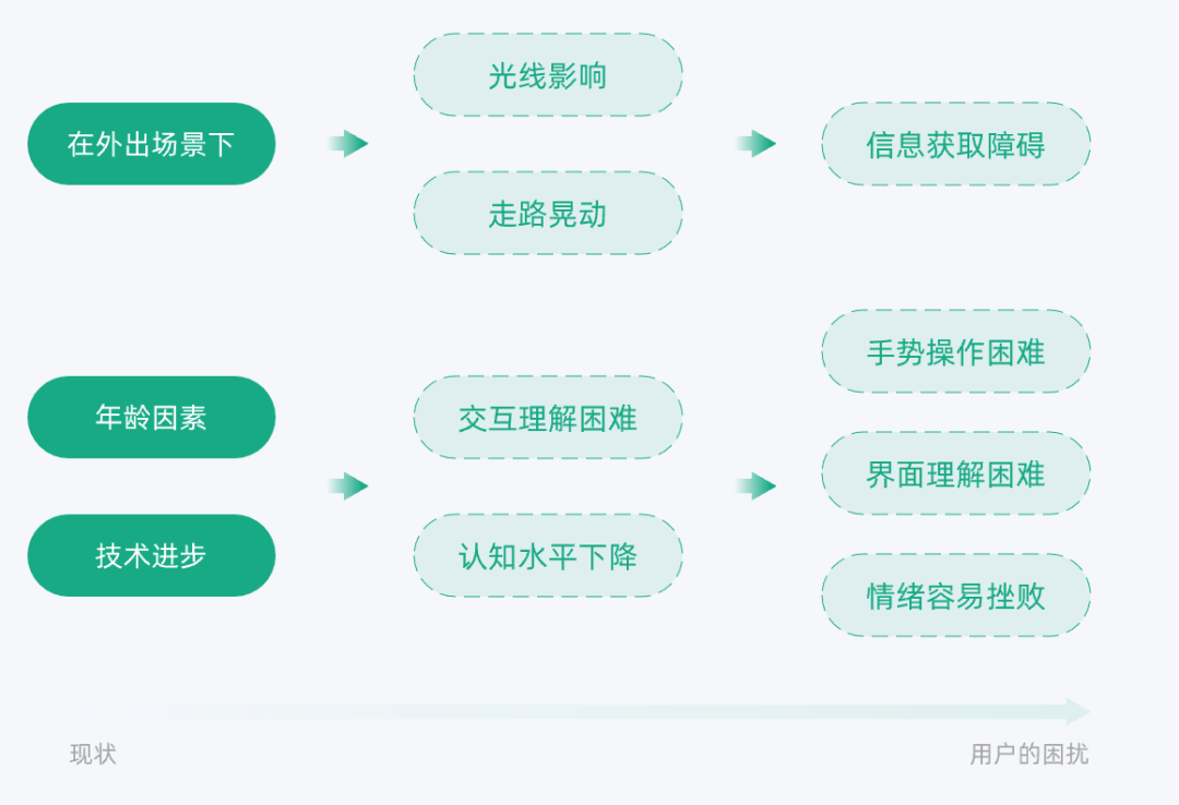 站在用户同理心的角度,针对用户信息获取障碍、手势操作困难、界面理解困难、情绪容易挫败这些比较明确的痛点,运用专业化的设计思路,把需要解决分问题点梳理清楚,再具体出设计方案