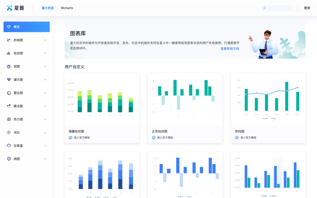 星图(含图表库和Wcharts):提供数据可视化所需资源,含图表、报表、大屏、公共数据等,目的是降低数据可视化成本。