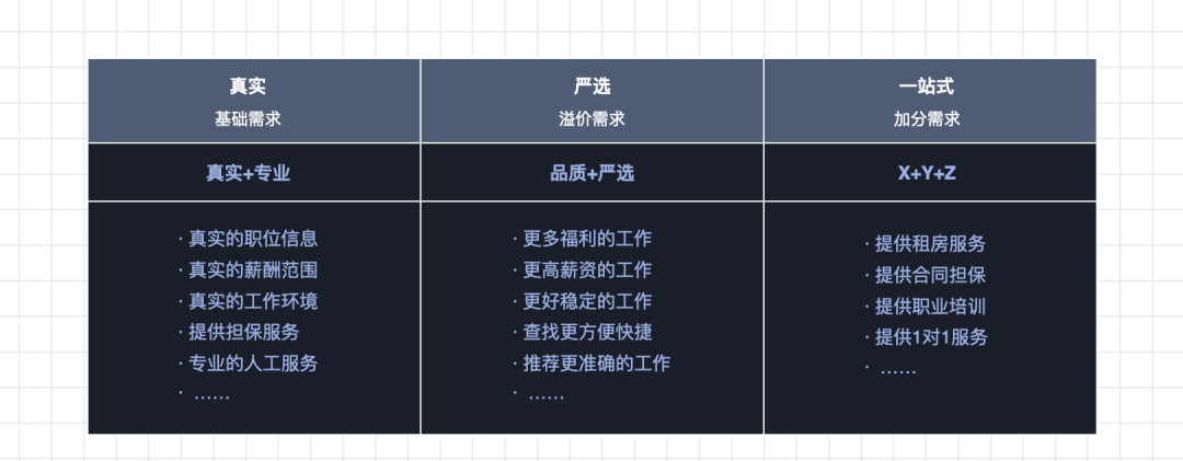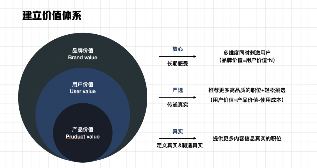 **强调产品价值:**我们结合用户的基础需求,根据需求内容定义“真实”内容,例如:真实的薪资、真实的工作环境、真实的工作内容等,第二步则是通过产品底层逻辑或用户的评价反馈系统来创建这些“真实”。