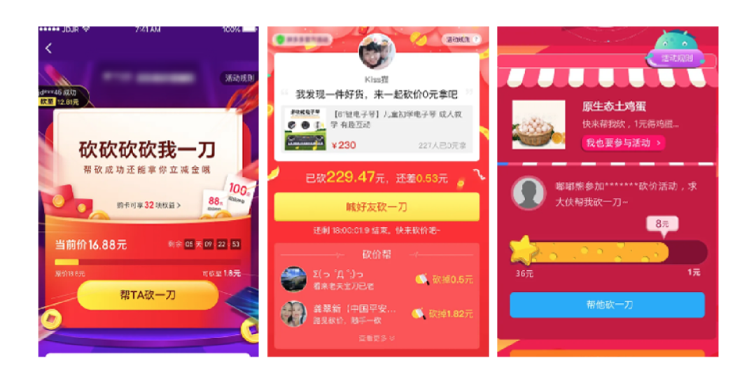 说到运营活动不得不提到的就是某多多,某多多的成功靠着拼单省钱这个运营思维让上亿用户都曾帮着朋友砍上一刀,随着这种运营活动的大肆推广,各大友商也随之效仿,越来越多的亲朋好友也在我的帮助下身受数刀而乐此不疲。