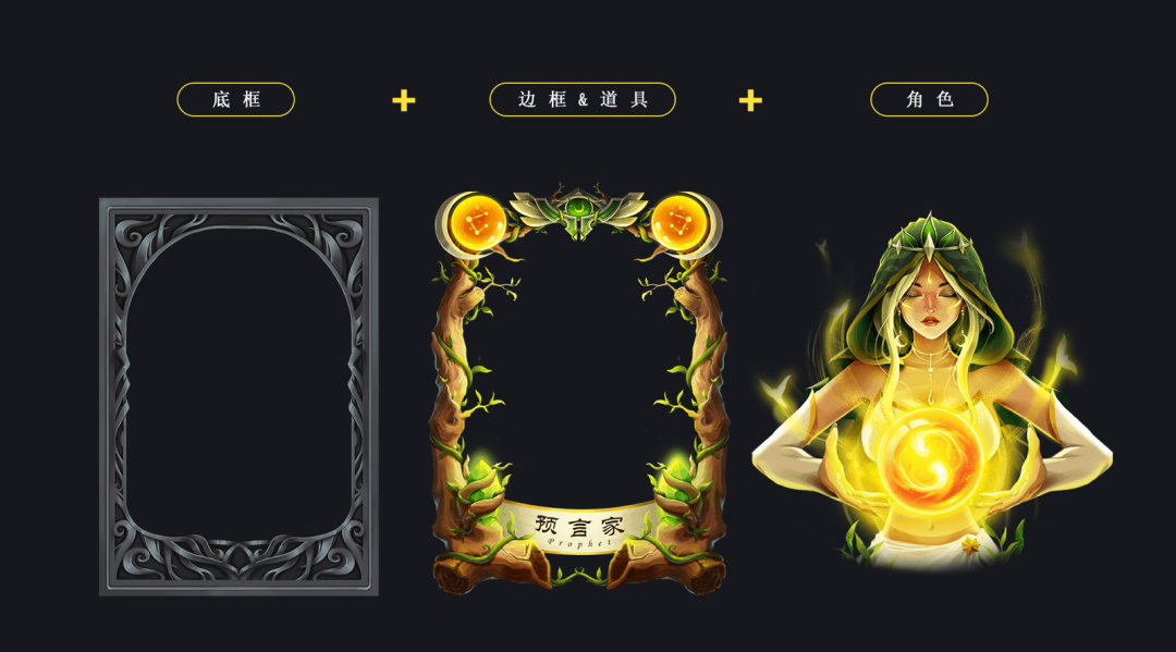 人物形象根据角色职业技能进行设定;设计风格为强氛围感的美式魔幻风格,突出卡牌氛围感并保证人物清晰度,角色比例选择展示腰部以上,角色以正面和四分之三面为主,角色的姿态和样貌根据角色设定具体设计;三大阵营以边框和氛围颜色做区分,同阵营边框(除道具外)不变;卡牌设计包含底框、边框、角色,道具设计在边框顶端两侧,根据角色替换。