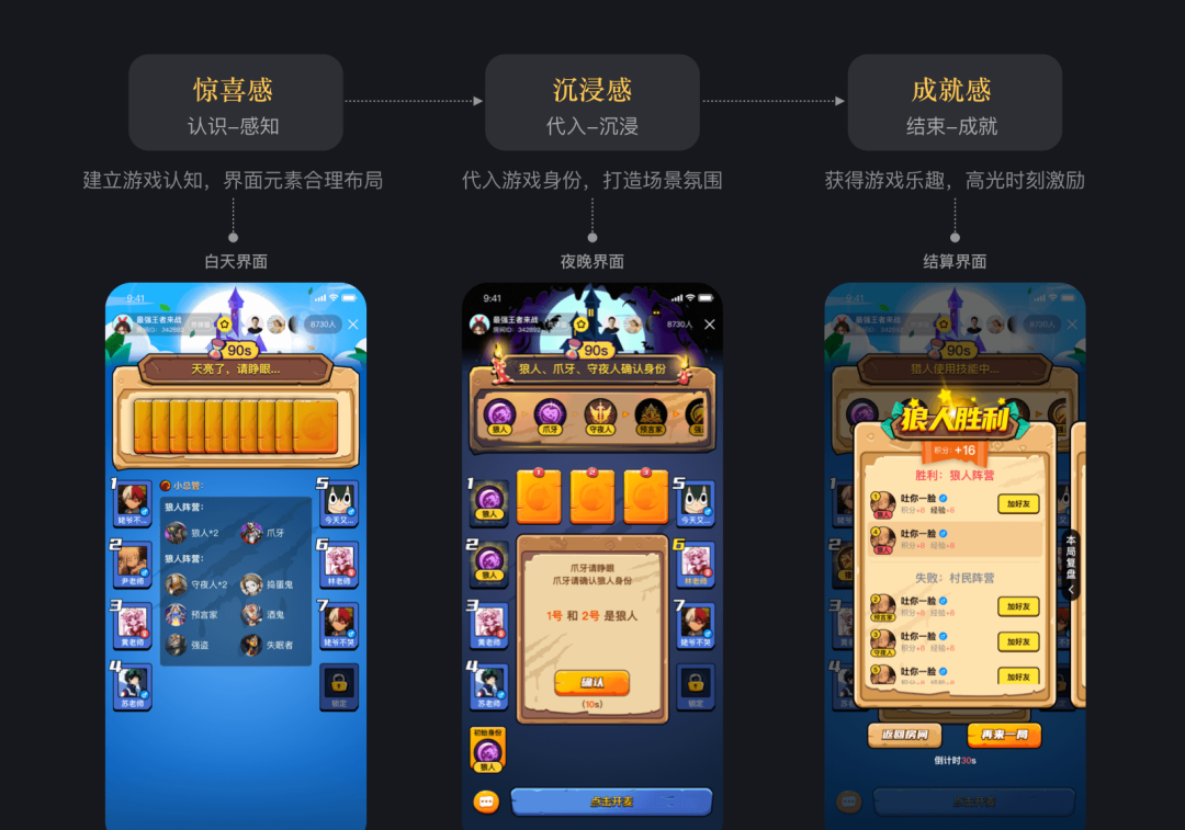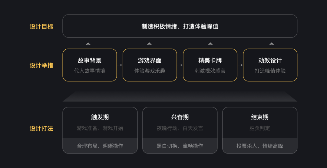 结合故事背景设定,以易用性原则为基础,加入情景化设计,在【触发期】制造惊喜感,合理布局,明晰操作,快速上手游戏;【兴奋期】代入沉浸感,黑白场景切换,沉浸游戏;【结束期】凸显成就感,高光时刻,强视效感知,胜负判定。