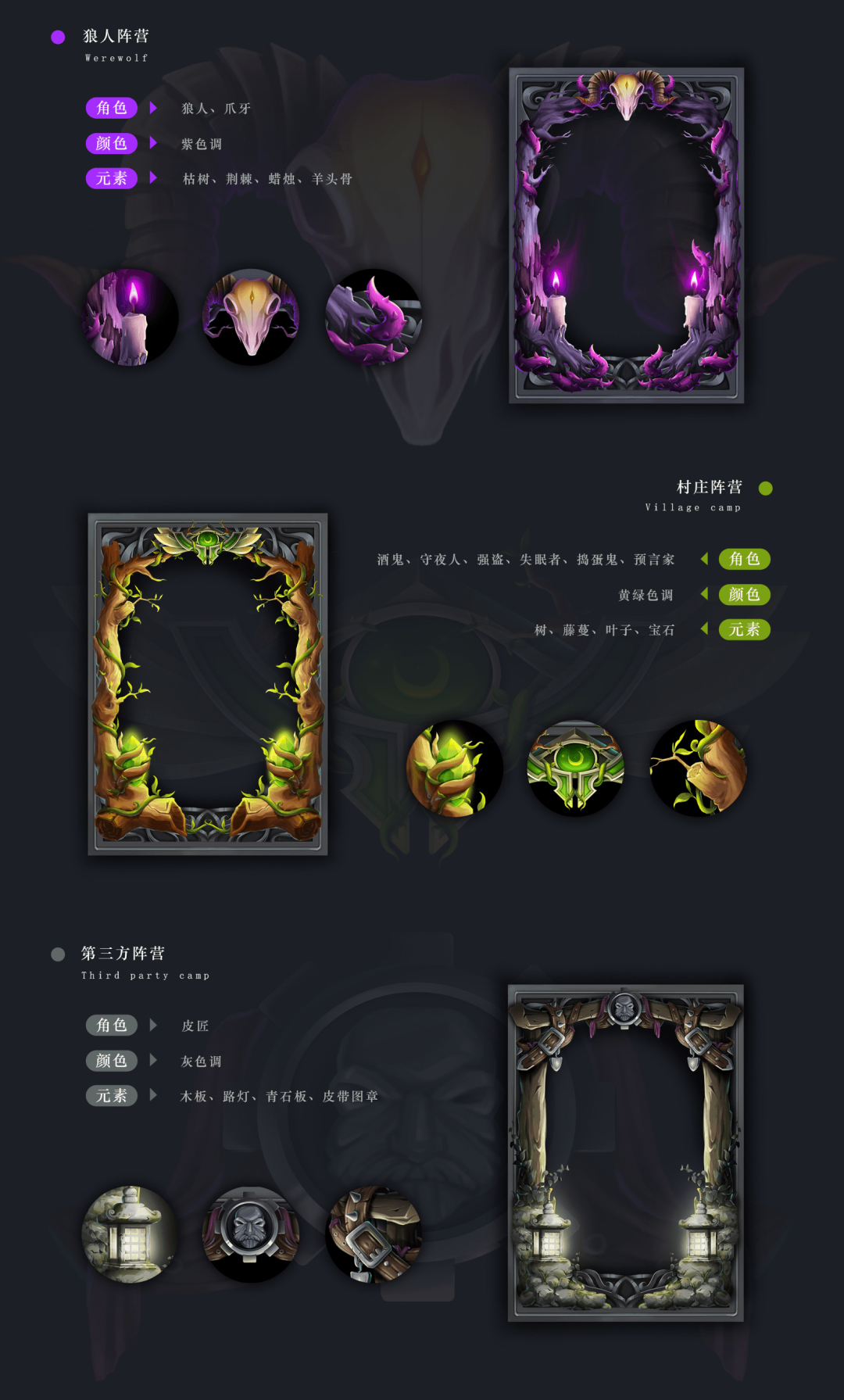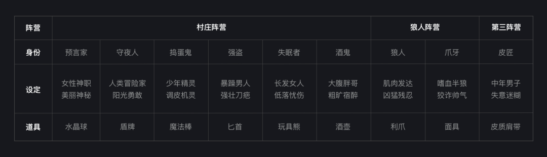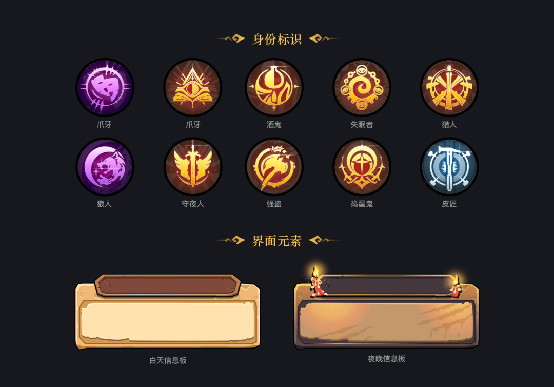 卡牌作为整个游戏的灵魂,代表玩家的身份,同时也会做成实物卡牌周边,作为奖品发放给玩家。身份角色设定:共计9个角色,分为三大阵营。好人阵营:预言家、守夜人、捣蛋鬼、强盗、失眠者、酒鬼;狼人阵营:狼人、爪牙;第三阵营:皮匠。