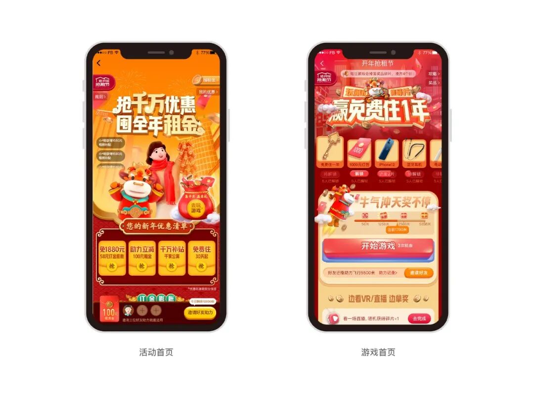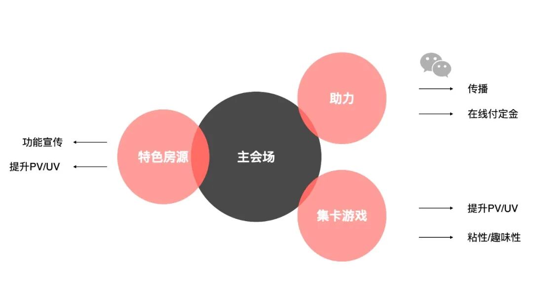 明确了活动目标后就是确定活动形式。形式上,主会场主要展示各类特色房源和优惠房源;在线付订金功能通过助力游戏展示传播;游戏会场的主要任务是收集奖品卡片 ,通过任务去到直播看房/VR看房会场及租房大类页,提升这些功能页面的pv和uv;一飞冲天和写牛字两个互动游戏,增加节日气氛,让用户持续参与,增加粘性。