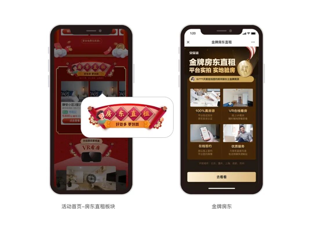 58租房最大的特点就是有着大量的房东直租的房源,可以直接和房东沟通,免去了中介费, 用户能享受到最大的实惠。近些年不断加大对房源的筛查,推出安选房源功能,确保真房东真直租;去年更是推出金牌房东升级服务,房源经平台实地三重核验,结合线下VR实拍,并支持在线签约功能,为房东提供全面服务,保证出租时效,同时为租户提供了100%真房源的全套线上租房流程及官方保障;活动中,首页特意为这类房源做了整合推荐,方便用户直接选房;