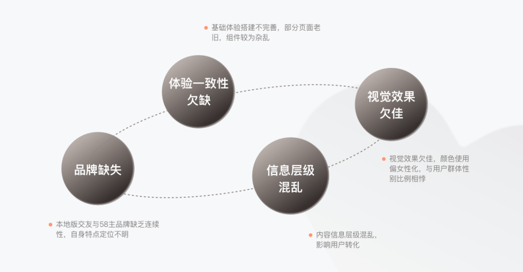 1.本地版交友与58主品牌缺乏连续性,透传力低,自身定位不明;