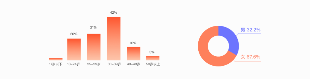 另外,通过对小程序的用户画像数据表明,我们的用户年龄层集中在25-39岁,其中,女性比例达到67.8%。