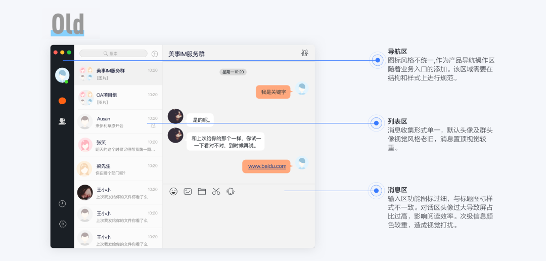 年初,因为疫情影响。线上办公突然成为热门话题。随着企业内部用户量的激增、功能不断完善及拓展,原有的PC端美事视觉风格和交互体验已经无法满足用户日益增长的体验需求。正值产品底层服务商更换为集团自主研发的微聊之际。因此,我们在此契机之下发起这次美事PC端改版项目。