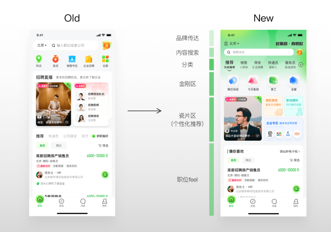 带着问题,我们选用了业务目标、用户调研以及线上体验走查等方法,梳理出了关键要点。从整体基调,到细节标签,连同产研团队一道,在内容和产品形态上做出对真职位定位的挑战和尝试。让用户在视觉感官上与需求产生共鸣,传递真职位和年轻化,是解决触达新老用户问题的关键。