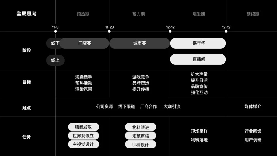 VGC分线上线下两块战场并行,在12月12日共同引爆。线下为主战场,通过两个阶段的赛事,筛选各款合作商手游赛事选手,最终于vivo游戏特邀的vip用户共同来到VGC现场进行游戏狂欢。线上主动直播间,线上线下联动,基于之前活动爆款直播的原型,进行换肤以及升级。整个活动3个不同的时期,每个时期目标与触点都不尽相同。针对不同阶段,设计侧分别制定了不同的设计任务。