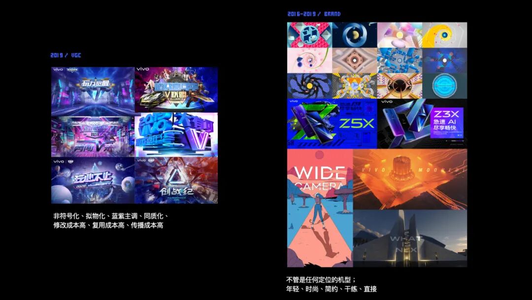 VGC十分年轻,只有两岁。前期素材收集汇集了去年的所有主kv,得出整体风格拟物化为主,蓝紫色为主调,看得出来赛事类大咖KPL对整个行业影响十分根深蒂固。对于vivo游戏对外的透传,此类风格修改成本较高、同质化程度高,较难拉开与市场竞品的距离。接着,收集了部分最近几年各大厂商帮vivo做的视觉,完全是另种感受,年轻、时尚、干练。所以,2020将对VGC视觉表现尝试做全新诠释。