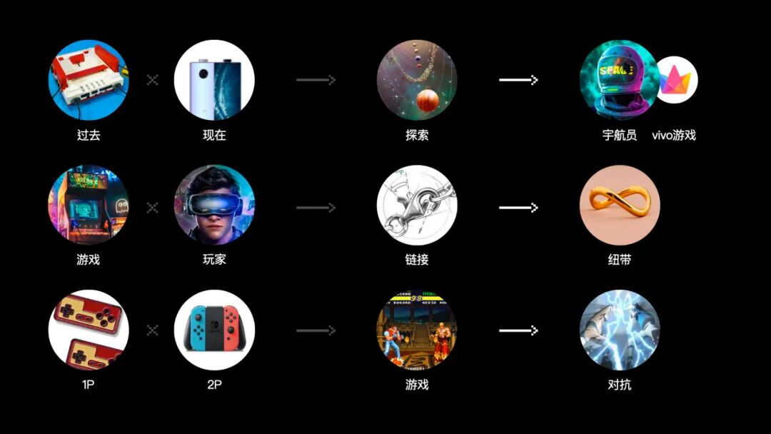 从过去的红白机、小霸王、街机、Gameboy等到现在的手机,都是游戏的承载体,vivo游戏在中扮演了重要的角色,不断探索、发现、改进,这种精神属性犹如勇敢孤独的宇航员,在人类未知的边界摸索发现;VGC作为年度盛事,除了回馈玩家外,也成为游戏与玩家中的重要纽带,链接了现实与虚拟的关系,∞符号一语双关,即意链接又表无限可能;在游戏场景中,合作与对抗是玩家与玩家间、玩家与游戏间的主要关系,即矛盾又统一,要表达对抗又要表现合作。综上,三个结论与三个疑问将如何落地?