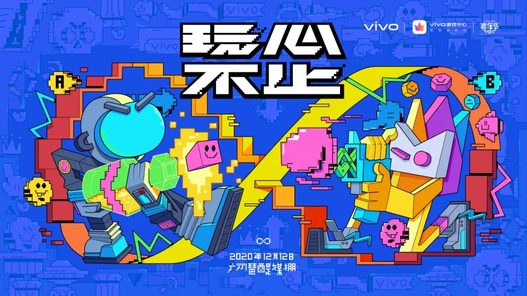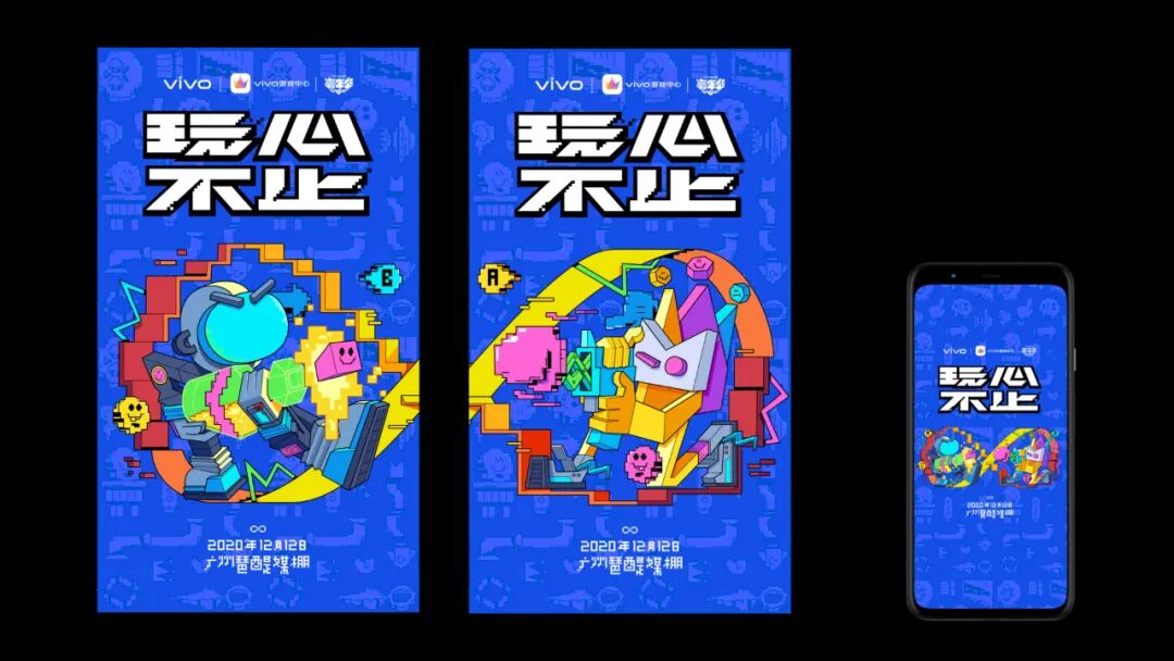 整体颜色以vivo企业色打底,配以高饱和的黄、橙、粉、紫等点缀,烘托活动氛围,打破大量蓝色赋予的冷静。宇航员与vivo游戏logo演变的吉祥玩偶欢快对战,拿着香槟与无公害手枪,像在打斗实则玩闹。∞符号用像素、直线两种表达方式组成,表达了矛盾却又统一的概念。
