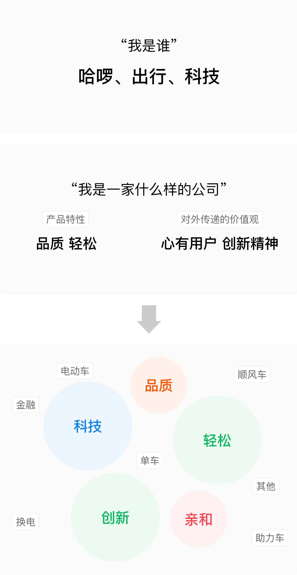 哈啰出行是一家聚焦于出行领域的科技公司,我们的产品特性是“品质、轻松”,对外传递的价值观是“心有用户,创新精神”。由此我们提炼出企业层面的关键词:品质、轻松、亲和、科技、创新。