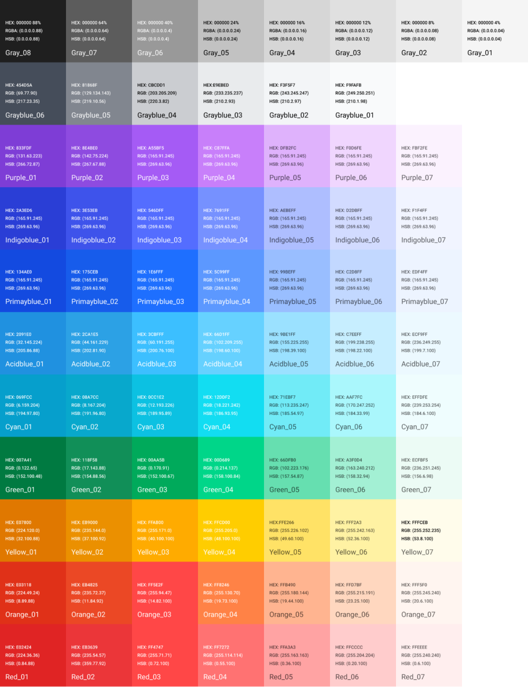 腾讯文档包含核心蓝色、蓝灰色、中性灰色及其他辅助色,按照颜色属性,将其命名为:Primayblue、Gray、Grayblue、Purple、Indigoblue、Acidblue、Cyan、Greenblue、Yellow、Orange、Red,并在命名中加入色阶后缀。