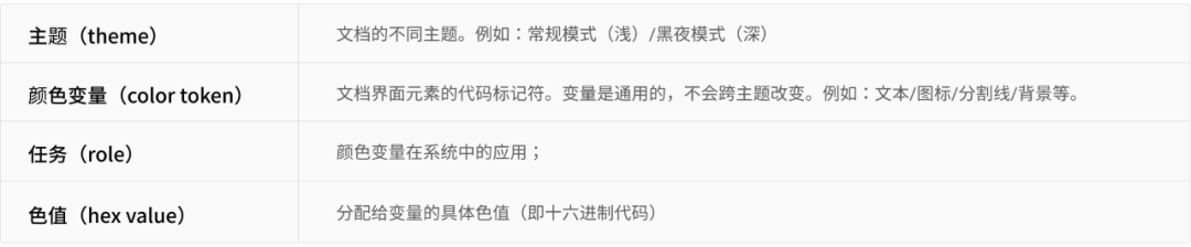 于是在腾讯文档中,我们开始采用颜色变量(color token)和主题(theme)来管理颜色,颜色变量(color token)基于任务(role)、主题(theme),为UI中的任务指定十六进制代码的色值(hex value),以弭平设计师之间、开发与设计师之间的沟壑,将颜色变量(color token)嵌入设计组件中与开发代码形成联动,便于开发利用程序中的变量来做全局修改,横向提升团队的协作效率。