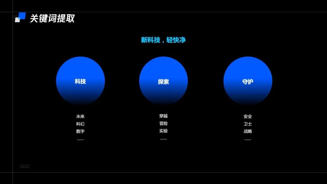 基于“新科技、轻快净”的品牌定位,以及“产业数字化升级的安全战略官”的品牌使命,我们脑暴了许多能与之联系起来的关键词。“新科技、轻快净”这个Slogan在内容上突出了科技的纯粹,效率,以及对于未来的探索,而品牌使命“产业数字化升级的安全战略官”给人守护和助力的感受。在综合多个关键词对比之后,最终选择了科技、探索、守护三个关键词作为本次系列插画的发散点。